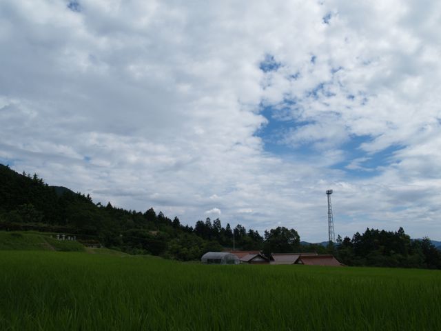 当地を含む西日本の広い範囲で7月8日に梅雨が明けました。七夕の翌日とは皮肉なものですね。それはともかく、梅雨明け発表を待っていたかのように、青空が広がり陽光が照りつけ始めました。今日はやや雲が多いものの、梅雨の晴れ間とは違って茹だるような暑さでした。午後、隣町の郵便局に行った帰路、“プチ高原”には無い広い田んぼの写真を撮りました(上写真)。北方に崩れ始めた積乱雲が見られます。夕立が降っていたのかも知れません。その後、わが“プチ高原”が望める地点に車を止め、今度は望遠で“プチ高原”のズームアップ写真を撮りました(中写真)。この谷の最上段の棚田が義父母の田んぼです。帰宅したその足で、炎天下の田んぼに出かけてみました。隣町で見た広い田んぼの風景とは異なりますが、それでも稲は順調に育っています(下写真)。昨夜は残念ながら写真に撮れませんでしたが、この田んぼ周りの林縁で舞う蛍の光を見ました。予報によると、明日こそ雲の多い天気のようですが、当分の間、雨の予報はありません。それにしても、毎年思うのですが、梅雨明け発表と共に、何の断りも無く、手の平を返したように、当然のことのように、週間天気予報が大きく変わっているのはどういうことでしょうね(笑)ところで、嬉しさの表現方法としてタイトルに年柄も無く絵文字(*^~^*)を入れてみましたが、どうでしょうか?