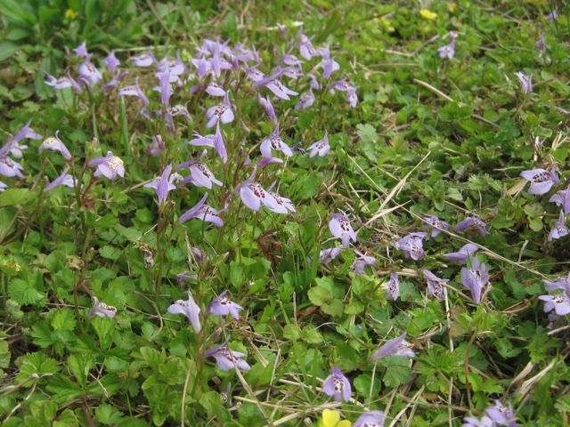 棚田最上段の廃田には、草刈機で刈り払われる“雑草”の範疇には入れたくない“野草”の群生が見られます。最初に、ムラサキサギゴケの群生です(上写真)。ランナーを出して四方八方に広がるため容易に群生状態になるようです。かつて、自宅から車で約30分の県道脇で廃田全体を被うように繁茂するムラサキサギゴケの群生を見たことがあります。グランドカバープランツとして植付けられたかのような見事な群生でした。次に、別名ニョイスミレ(如意菫)とも呼ばれるツボスミレ(坪菫)です(中写真)。繁殖力旺盛であちこちに群生します。花の一つ一つはかわいいものの、地味な群生です。最後に、言わずと知れたレンゲです(下写真)。豆科の植物は、大気中の窒素を直接吸収して根粒に蓄えるので、窒素肥料の代わりになることから、豆科のレンゲを田んぼで栽培し、それを土中に鋤き込んで窒素肥料として使ったそうですが、この廃田のレンゲはその名残です。出来ることなら、耕作中の田んぼにレンゲを再び戻したいものです。